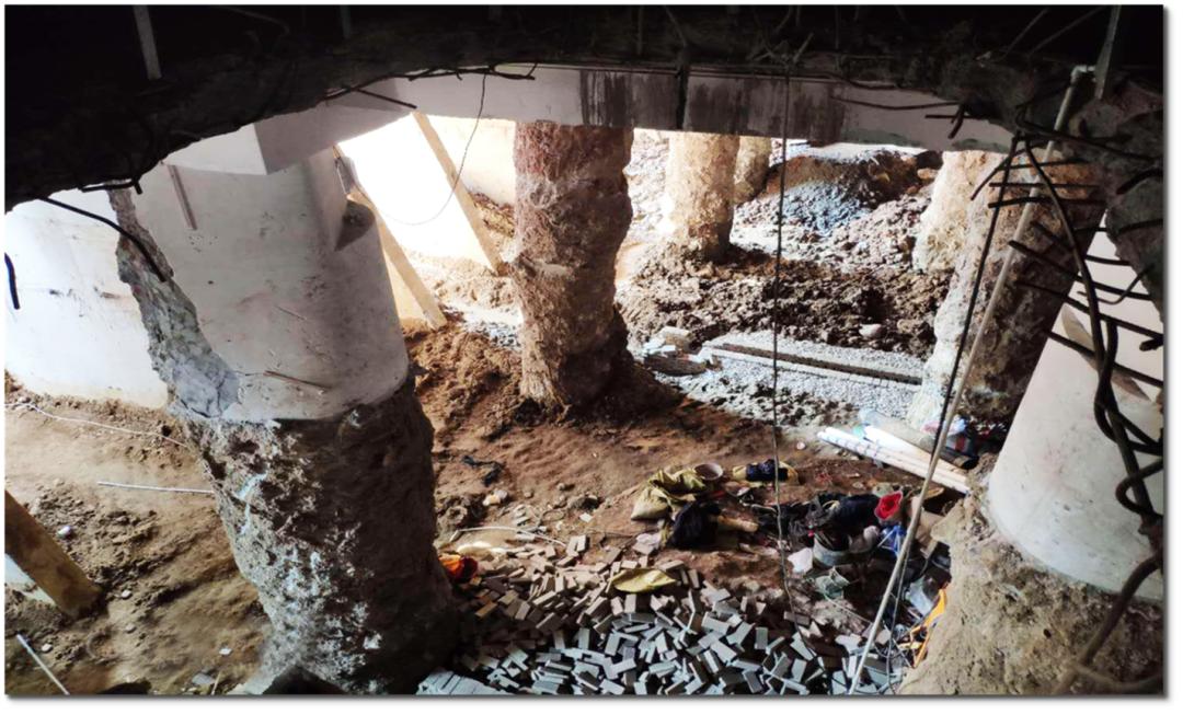 经组织市建科院及晋安区技术组专家实地查看,4户别墅地下室覆土均已被掏空,开挖深度达6米,面积约1800平方米,局部已挖至持力层,部分灌注桩桩身被破坏,部分钢筋混凝土挡土墙被切割,地基支撑柱全部暴露在外。